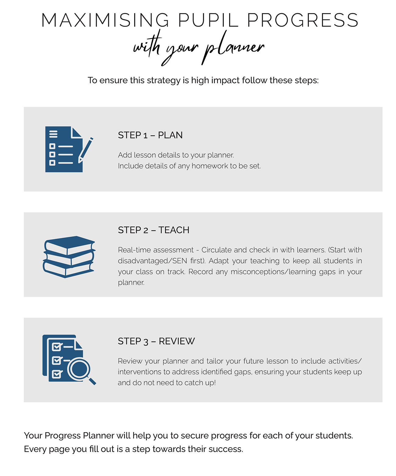 For years, Laura designed bespoke planners for schools, but now you can have your own. The Progress Planner is packed with tools and strategies proven to deliver results, based on the plan-teach-review method Laura has successfully used to drive progress in schools nationwide.